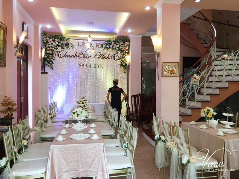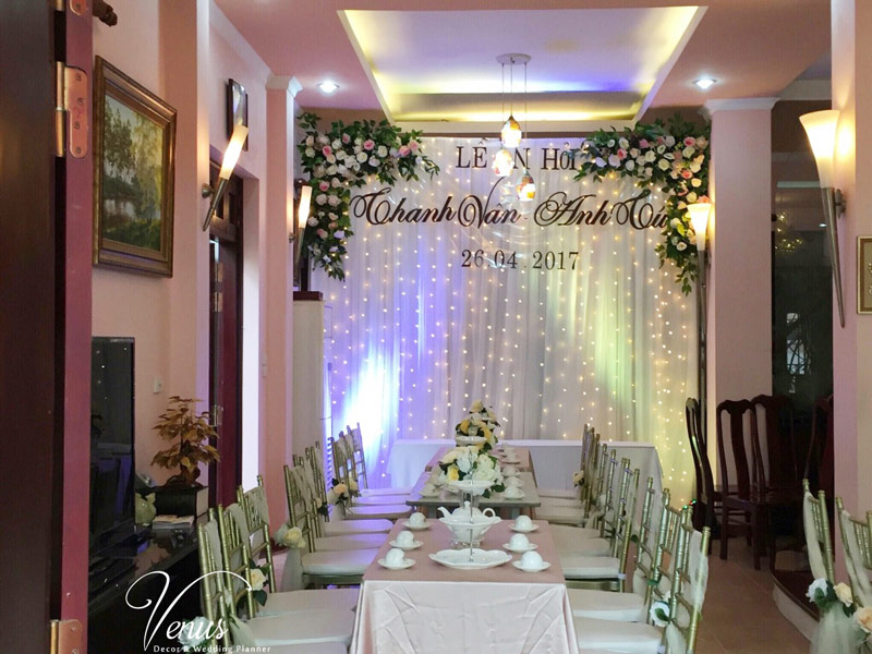 Trang trí đám hỏi tại nhà được Venus cùng khách hàng lên ý tưởng và cùng thực hiện. Với phong cách trang trí tiệc cưới sang trọng mang tới cho quý khách hàng một không gian đẹp, có những bức ảnh với phông nền nổi bật.